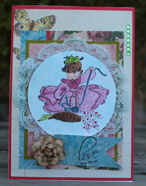 Today, my project features two red rubber stamps found in the PPRS store; Love is in the Air and Girl with Basket. I super love this little vintage girl with her basket of flowers. Amazingly adorable!